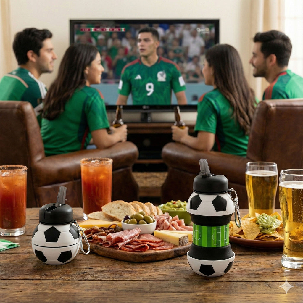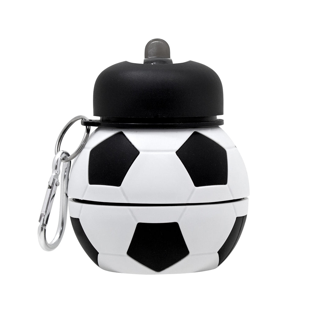 Botella plegable con forma de balón de fútbol, que al abrirse muestra un mini campo de juego. Tapa con boquilla y seguro antivuelco, y mosquetón de aluminio para llevarla a cualquier lugar.