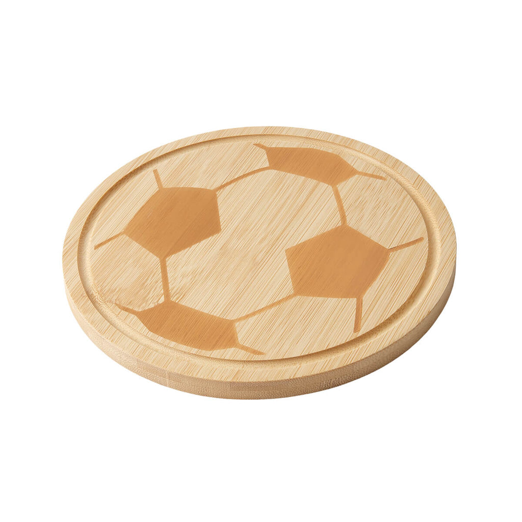 Tabla de bambú con forma de balón, diseñada con un bisel interior que ayuda a contener líquidos y evitar derrames. Al estar hecha de madera natural, cada pieza tiene vetas y tonalidades únicas.